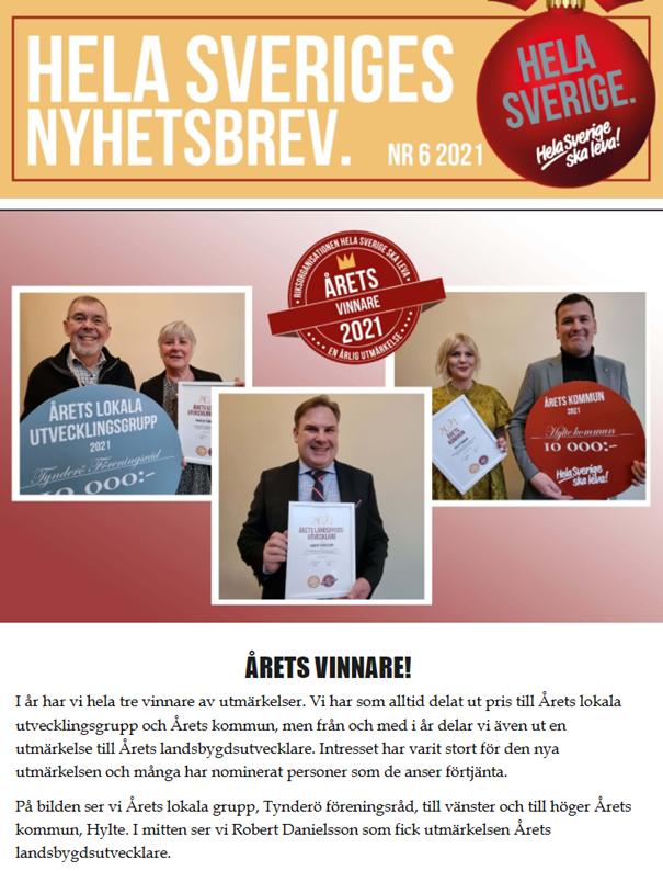 I Riksorganisationen Hela Sverige ska levas (HSSL:s) sjätte och sista nyhetsbrev för i år kan man bland annat ta del av de viktigaste datumen för den svenska Landsbygdsriksdagen i Jönköpings län i maj nästa år. Man presenterar även vinnarna av utmärkelserna Årets lokala grupp, Årets kommun och Årets landsbygdsutvecklare. Vidare presenteras senaste avsnittet i podden Hela Sverige pratar, samt andra aktualiteter.