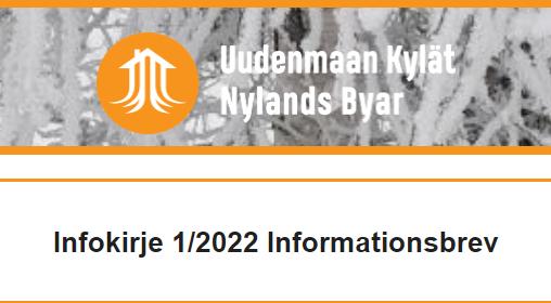Nylands Byar har utkommit med sitt första informationsbrev för i år med info om vinnaren av Årets Nyländska By 2022, fortsättningen för projektet Föreningshus i utveckling, Hållbarhetsveckan, digitala tidningen Nylands Byar, projektbidragsansökningar från Leader-grupper, distansutbildning och webbinarier, kampanjen Stolt över Byn, samt Öppna Byarnas dag.
