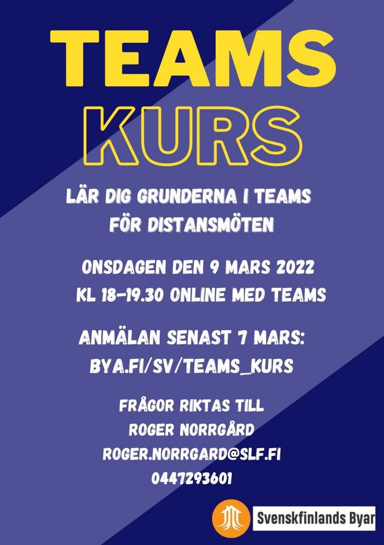Onsdagen den 9 mars kl. 18-19.30 ordnar Svenskfinlands Byar en grundkurs i Microsoft Teams. På kursen får man bland annat lära sig grundläggande funktioner och inställningar, samt hur man ordnar sitt eget Teams-möte.