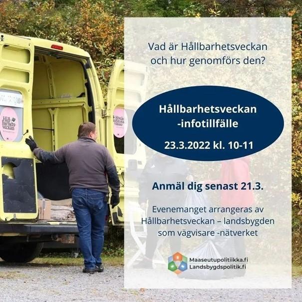Evenemanget arrangeras av landsbygdspolitiska nätverksprojektet Hållbarhetsveckan – landsbygden som vägvisare. Nätverksprojektet förverkligas av Svenska lantbrukssällskapens förbund, Finlands Byar och Åbo Akademi. Anmäl dig senast 21.3 via denna länk.