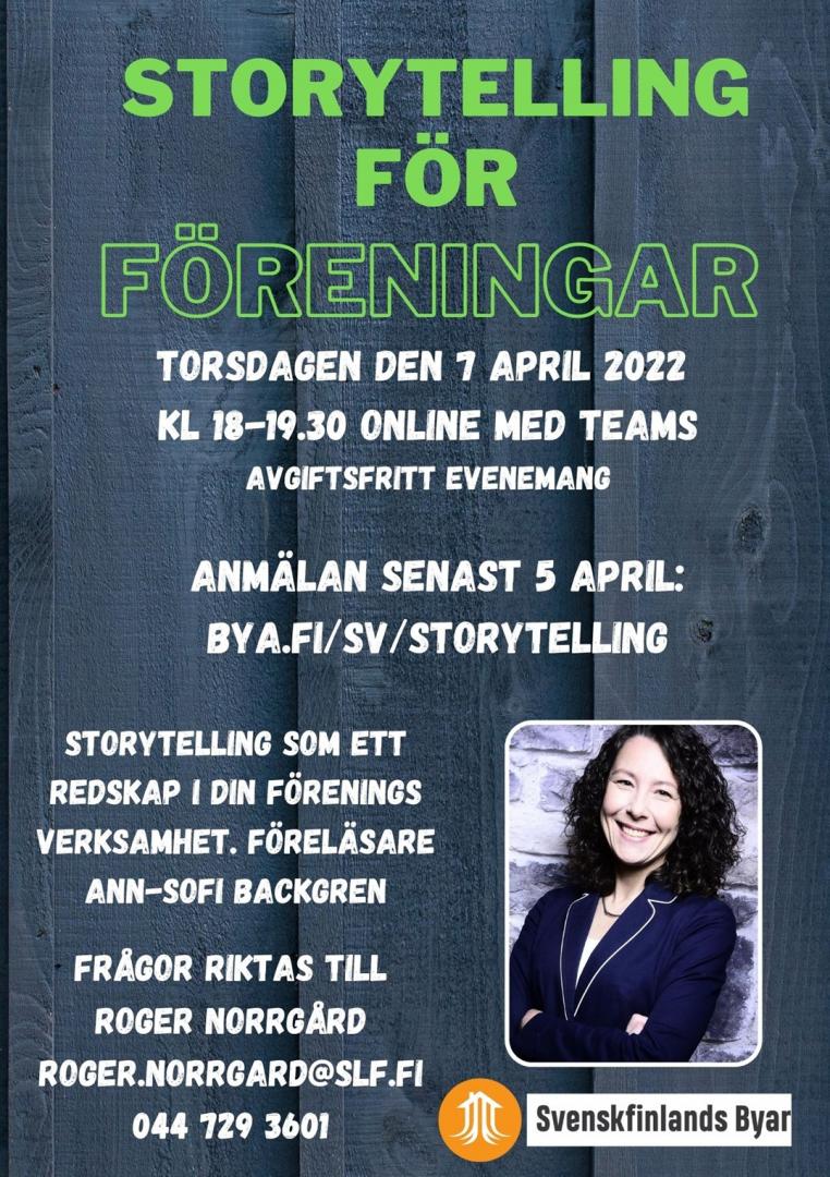 Torsdagen den 7 april kl. 18.00-19.30 ordnas en gratis kurs i storytelling! Kursen är riktad till alla intresserade och främst till de som är föreningsaktiva. I kursen ser vi på hur storytelling kan användas för att på ett intressant sätt berätta om er förening och den verksamhet som ni ordnar. Föreläsare är inspiratören Ann-Sofi Backgren och kursarrangör Svenskfinlands Byar.