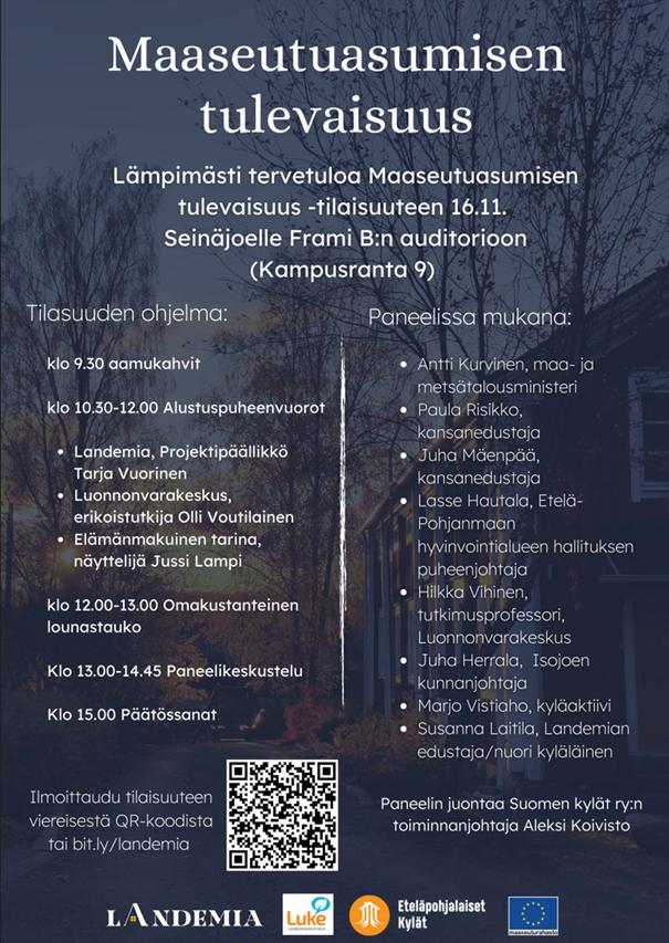 Landemia-projektet ordnar ett diskussionstillfälle om landsbygdsboendets framtid, Maaseutuasumisen tulevaisuu, den 16 november i Seinäjoki /Frami B (Kampusranta 9). Man får bl.a. ta del av info om Landemia-projektet och dess forskningsresultat. Tillfället, som avslutas med en paneldiskussion, kommer även att streamas. Länken meddelas senare på webbplatsen landemia.fi.