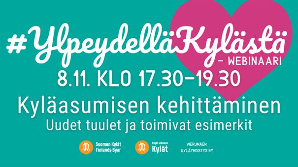 Den 8 november kl. 17.30-19.30 avslutas webbinarieserien Ylpeydellä kylästä (Stolt över byn) med det fjärde webbinariet som behandlar landsbygdsboendets utveckling, Kyläasumisen kehittäminen – uudet tuulet ja toimivat esimerkit. Man får höra hur befrämjandet av flyttning till landet inte bara är försäljning av tomter och hus, utan även möjliggörandet av nya boendeformer, samt framhållandet av gemenskapsandan. Vidare får vi veta hur boendet på landsbygden ännu kunde utvecklas och hurudana fungerande exempel som finns på ett nytt slags boende i byn.