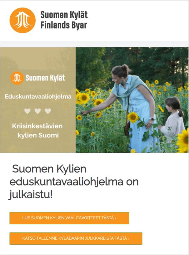 Finlands Byar rf har utkommit med oktober månads nyhetsbrev som innehåller organisationens riksdagsvalsprogram, info om höstens Byadagar i Jyväskylä 2-3.11, Öppna Julbyar och Finlands Byars julkalender, fototävlingen Finlands Sämsta Byväg, webbinarium om framtidens by 26.10, webbinarium 1.11 med rubriken Vad är en smart by?, Stolt över byn-webbinarium 8.11, webbinarium 17.11 som diskuterar landsbygdsboendet för tavastländska idylliska byar, diskussionstillfälle i Seinäjoki16.11 om landsbygdsboendets framtid, utbildning för föreningsmänniskor, Finlands Byars framtidsutskott för ungdomar som vill se mer unga i byaföreningarnas styrelser, en kommunikationspraktikants erfarenhet hos Finlands Byar, dikten Kyläs Suames, samt lite aktuellt från det finlandssvenska landsbygdsutvecklingsfältet.