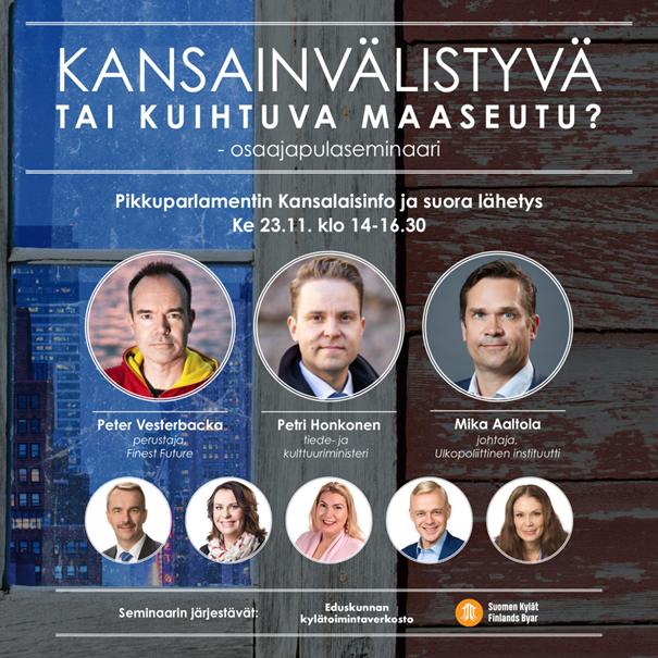 Finlands befolkningspyramid tippar över och kompetensbristen växer. Även landsbygdskommuner konkurrerar om unga och kvalificerad arbetskraft. Vi behöver utbildnings- och yrkesbetingad invandring och flyttning till landet, så att vi kan tillhandahålla tjänster i kommuner och byar och säkra arbetskraft till landsbygdsföretag. Hur ska nästa regering lösa utmaningen? Hur får vi internationalitet och yrkeskunnig arbetskraft till landsbygden? Seminariet, som hålls 23.11 kl. 14-16.30 i Lilla Parlamentets medborgarinfo, Arkadiagatan 3, Helsingfors, kommer även att streamas. En länk sänds till de som anmält sig.