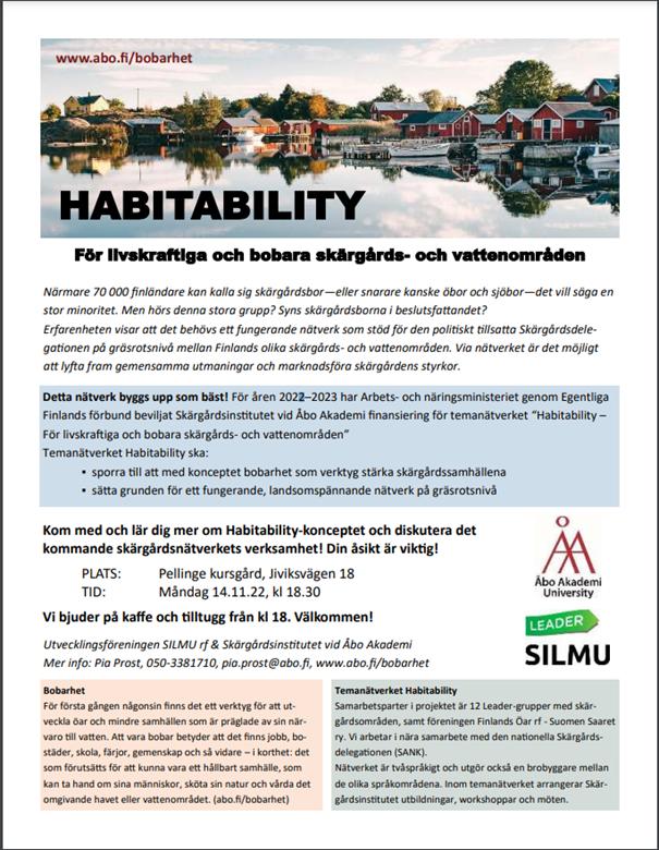 Habitability-projektet jobbar för livskraftiga och bobara skärgårds- och vattenområden. Målet är att bilda ett nätverk på gräsrotsnivå, som gör det möjligt att lyfta fram gemensamma utmaningar och marknadsföra skärgårdens styrkor. Kom med och lär dig mera om bobarhet och diskutera det kommande skärgårdsnätverkets verksamhet den 14 november kl. 18.30 i Pellinge.