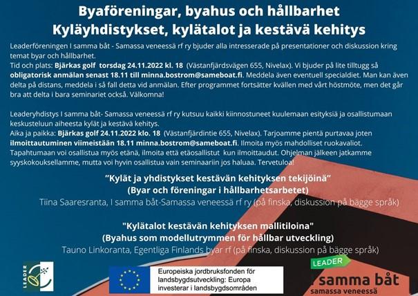 Leader-föreningen I samma båt – Samassa veneessä rf ry bjuder alla intresserade på presentationer och diskussion kring temat byar och hållbarhet. Tillfället hålls 24.11 kl. 18 vid Bjärkas golf (Västanfjärdsvägen 655, Nivelax).