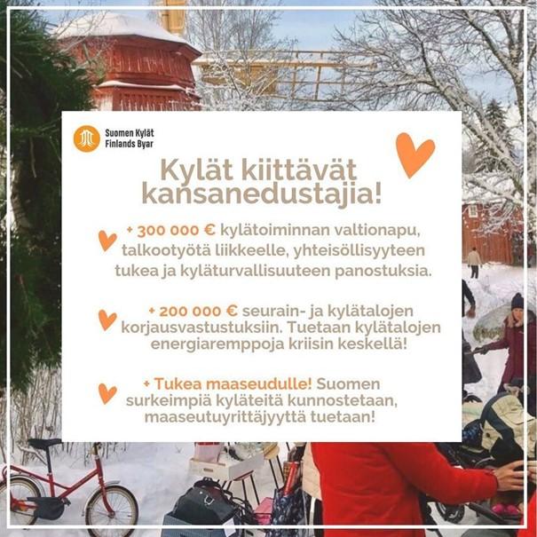 Riksdagens finansutskott har gjort små småjusteringar i budgeten för år 2023. Med 300 000 euro i ”julklappspengar” hålls byaverksamhetens statsbidrag på samma nivå som år 2022 eller 1 400 000 euro. Byaverksamhet förebygger marginalisering och befrämjar livskraft och byatrygghet. Även renoveringsbidrag till föreningshus och byagårdar fick ”julklappspengar”, samt mången byväg.