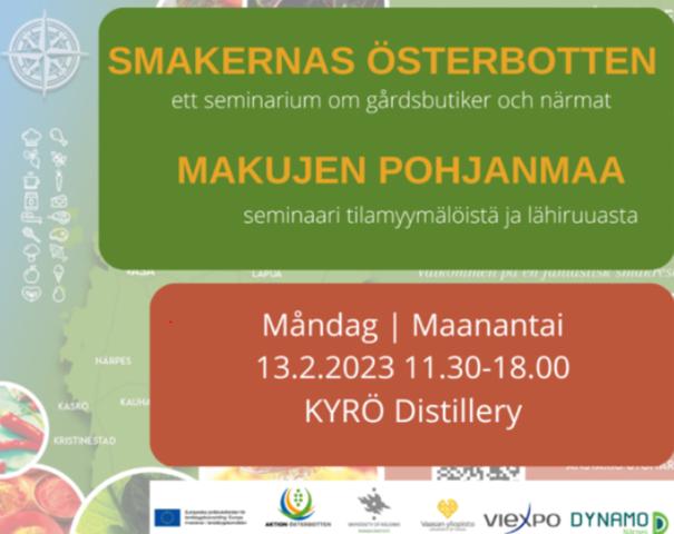 Måndagen den 13 februari hålls ett seminarium om gårdsbutiker och närmat i Kyrö Distillery i Storkyro. Seminariet inleds kl. 11.30 med lunch (enligt anmälan). Programmet vidtar kl. 12.15 då Mats Sabel från Dynamo Närpes talar om nätverket av gårdsbutiker i Matriket Österbotten. Ämnet för Meira -Pia Lohiluoma från ProAgria ÖSL är planer för framtiden. Ida Segerström-Wester från Skördefestens vänner rf talar om den åländska skördefesten efter 25 års utveckling. Rubriken på jord- och skogsbruksminister Antti Kurvinens inlägg lyder: Österbotten är ett matrike, nu och i framtiden. Tillställningen avslutas med en destillerirunda kl. 17-18 (enligt anmälan).