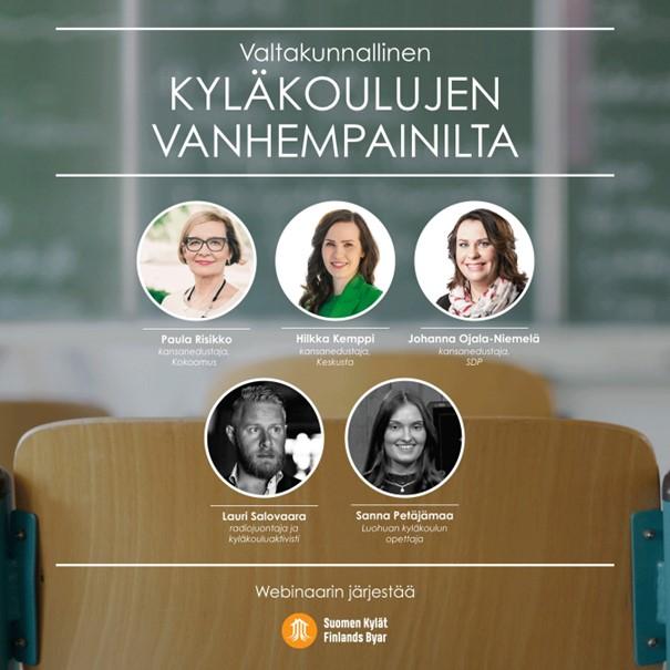 I webbinariets paneldiskussion finns Lauri Salovaara, företagare och aktiv försvarare av byskolor, Sanna Petäjämaa, lärare för Luohuan kyläkoulu, och riksdagsledamöterna Hilkka Kemppi (C), Johanna Ojala-Niemelä (SDP) och Paula Risikko (Saml).