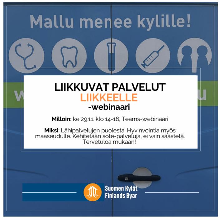 Under webbinariet ”Mobila tjänster i trafik på välfärdsområden” den 29 november kl. 14-16 får man höra om planerna i regeringsprogrammet, dela information om mobila tjänster och höra om praktiska erfarenheter från utvecklingsarbetet med mobila tjänster, samt hälsningar från de som redan arbetar med dem.