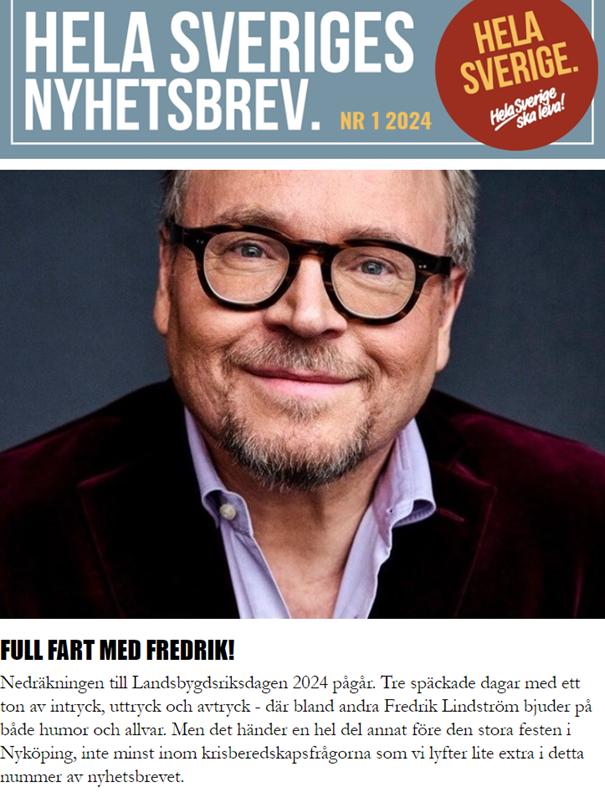 Riksorganisationen Hela Sverige ska leva (HSSL) har gett ut sitt första nyhetsbrev för i år, i vilket man lyfter upp att nedräkningen inför deras stora kalas Landsbygdsriksdagen 2024 pågår för fullt. Anmälan är öppnad och de sista bitarna i programmet håller på att falla på plats. Annars har krisberedskapsfrågor varit aktuella både inom HSSL och i det offentliga samtalet under inledningen av året. Detta belyses med en rapport från Folk och försvar i Sälen, ett fördjupande blogginlägg om vad forskningen säger om krisberedskap i landsbygder och ett tips om hur HSSL:s länsavdelning i Örebro län jobbar med frågorna. Man kan också läsa i nyhetsbrevet om: