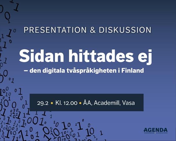 Agenda-rapporten Sidan hittades ej – den digitala tvåspråkigheten i Finland kartlägger den digitala verkligheten genom att granska hur offentliga myndigheter, kommersiella aktörer samt andra bygger upp sin språknärvaro på webben. Rapporten erbjuder även konkreta förslag på hur man skapar fungerande två- och flerspråkiga digitala lösningar.