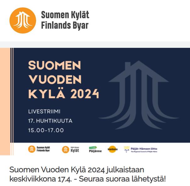 Följ utnämningen av Årets by på riksplanet i direktsändning. Tillställningen sänds på Youtube 17.4 under Byadagarna i Hollola. Mer om programmet finns i Finlands Byars senaste nyhetsbrev.