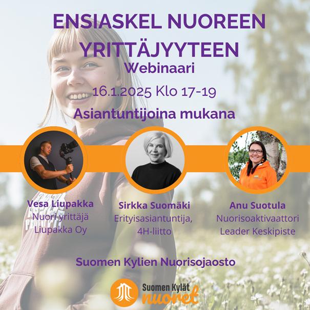 Välkommen till det första webbinariet för Finlands Byars framtidsutskott för ungdomar. Ämnet är entreprenörskap och fokus ligger på att ta de första stegen mot din egen färdväg. Oavsett om du bara drömmer om entreprenörskap eller redan har planerat, så är detta webbinarium för dig! Webbinariet hålls 16.1 kl. 17-19 och är öppet för alla som är intresserade av ämnet. Arrangör är r Finlands Byars framtidsutskott för ungdomar. Anmälan görs via anmälningsblanketten. De som anmält sig för en länk dagen innan webbinariet.