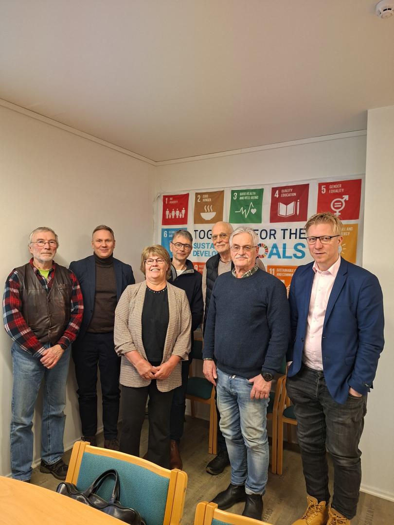 På bilden: Peter Backa, Mats Brandt, Carina Storhannus, Niklas Ulfvens, Ulf Grindgärds, Jerker Johnson och Aktion Österbottens nuvarande verksamhetsledare Mathias Högbacka samlades för att minnas Leader-verksamhetens gångna år.