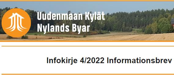 Nylands Byar har utkommit med sitt fjärde informationsbrev för i år med info om bl.a. ett webbinarium om landsbygdsboende 7.9, besök i arbetarnas hus i Ahmoo 21.9, Hållbarhetsveckan 26.9-2.10, presentation av Routio by, upplysning om att årets nyländska by 2023 söks i höst. ekonomiskt stöd för utbildning, finlandssvenska Landsbygdsriksdagen 26-27.10, samt nyttig information.