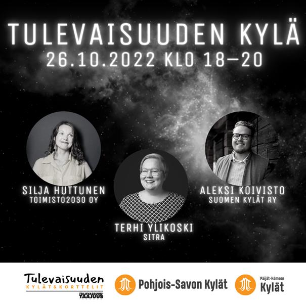 Byar och stadsdelar utmanas att vidga visionen om sin egen framtid. Hur kan man med hjälp av fantasin skapa framtidstro? Med vilka medel kan framtidsvisionerna förverkligas genom handling? Välkommen att delta i Tulevaisuuden kylä-ilta, vars mål är att stärka byarnas och stadsdelarnas framtidstro. Tillställningen hålls via Teams 26.10 kl. 18-20.