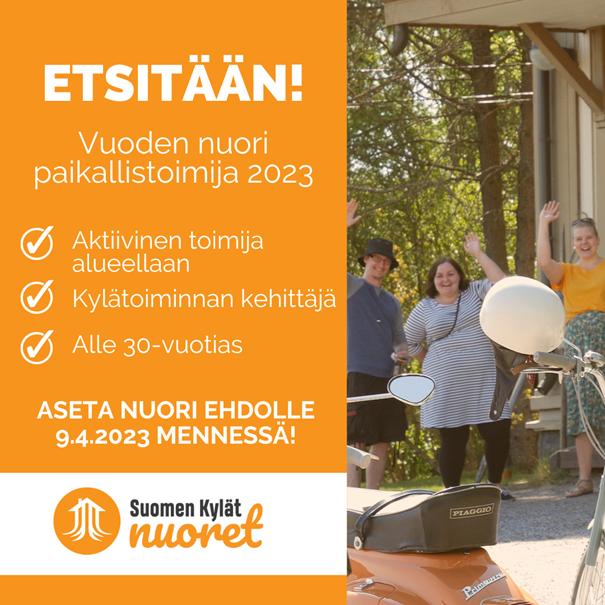 Känner ni någon som har gjort en betydande och långsiktig insats för byaverksamheten? Den unga lokala aktören ska vara under 30 år. Ge kortfattade motiveringar och föreslå Årets Unga Lokala Aktör! Vi tar emot förslag ända fram till och med 9.4 2022. Frågor riktas till Karoliina Ahtiainen, ordförande för Finlands Byar rf:s framtidsutskott för ungdomar, 0503019017, karoliina.ahtiainen@hotmail.com.