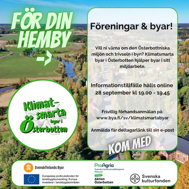 Torsdagen den 28 september kl. 19.00 kan man höra mera om vårt projekt Klimatsmarta byar i Österbotten. Kom med på ett inspirerande infotillfälle online och hör hur din förening eller by kan ta del i projektet, som Svenska lantbrukssällskapens förbund är projektägare för.