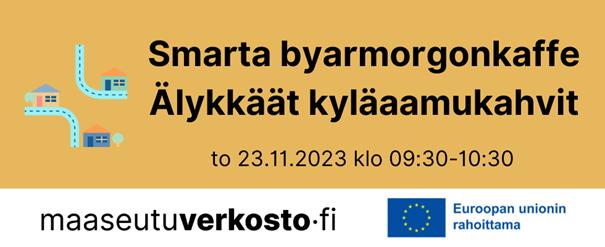 Temat för Smarta byar-morgonkaffet i november är Smarta byar, digitalisering och mobila tjänster. Vi får också gäster från våra grannar i väst till morgonkaffet och vi får höra exempel på Smarta byar-projekt från Sverige och Finland. Välkommen att lyssna på inspirerande exempel och inlägg den 23 november 2023 kl. 9.30–10.30!