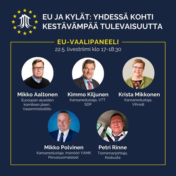 Paneldebatten, som diskuterar EU och byarna – tillsammans mot en hållbarare framtid, öppnas av ordföranden för Finlands Byar Arto Pirttilahti. I paneldebatten deltar fem kandidater till EU-parlamentet.