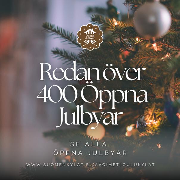 Julstämning, blinkande ljus och varma möten väntar i mer än 400 finländska byar när det landsomfattande evenemanget Öppna Julbyar återigen nalkas. I centrum för evenemanget står julaktiviteter som arrangeras av byaföreningar och andra lokala aktörer som erbjuder oförglömliga upplevelser för alla åldrar.